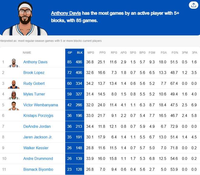 据统计,这是戴维斯生涯第85次单场砍下5+次盖帽,在现役球员排名第一,领先第二名布鲁克-洛佩兹高达13场。