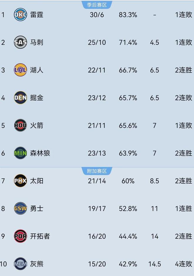 目前为止,太阳以21胜14负排名西部第七,落后第六的森林狼1.5个胜场,湖人则以22胜11负将战绩重新提升至第三。