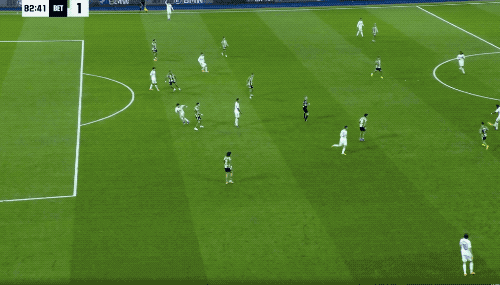第66分钟,皇马后防线被打穿,库乔连续两次过掉库尔图瓦,冷静将球打进。