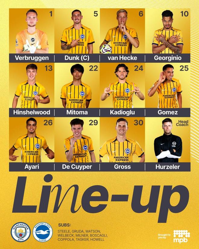 布莱顿首发:1-巴尔特-费布鲁亨、24-卡迪奥卢、5-邓克、6-范黑克、29-德克伊珀、10-吕特、13-杰克-欣谢尔伍德、25-迭戈-戈麦斯、26-亚辛-阿亚里、22-三笘薰、30-格罗斯