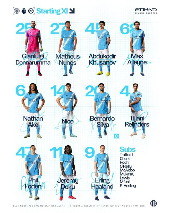 曼城首发:25-多纳鲁马、27-马特乌斯-努内斯、45-胡桑诺夫、68-阿莱恩、6-阿克、14-尼科-冈萨雷斯、20-伯纳多-席尔瓦、4-赖因德斯、47-福登、11-多库、9-哈兰德